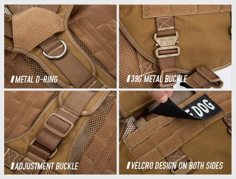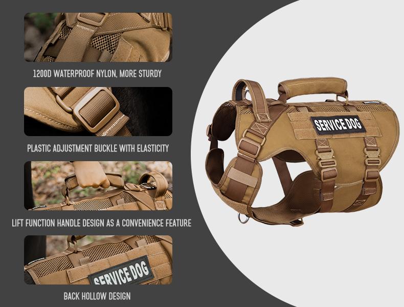 - [VELCRO and MOLLE]: Tactical dog vest equipped with Hook and Loop Panel, which allows you to DIY any of your military badge and patches (A "SERVICE DOG" Patch is included for you). The MOLLE system allow your dog to carry GEAR for training, hunting, walking, such as the dog bowl, water bottle, Molle Pouches (No Included).